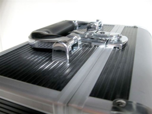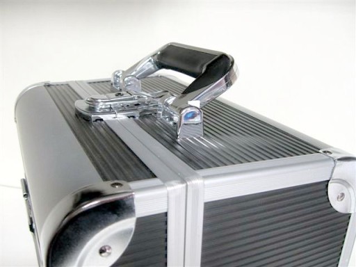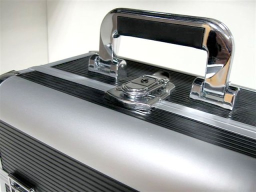 Kuferek CM 002 wykonany jest z czarnego materiału wykończony srebrnymi narożnikami po bokach. Dzięki temu kufer jest bardziej odporny na uszkodzenia.