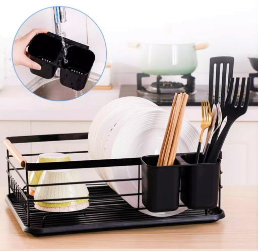 ✅Suszarka do naczyń charakteryzuje się bardzo wysoką jakość i trwałą i metalową konstrukcją. Wykonana z żywicy tacka chroni blat przed zamoczeniem. W zestawie znajduje się również plastikowy, dwukomorowy ociekacz na sztućce. Metalowa czarna suszarka z drewnianymi rączkami jest eleganckim rozwiązaniem do każdej kuchni.