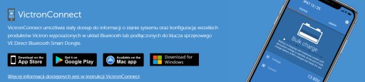Korzystając z aplikacji VictronConnect oraz urządzenia obsługującego Bluetooth (telefonu komórkowego lub tabletu) istnieje możliwość łatwego dokonania konfiguracji, monitorowania i aktualizacji oprogramowania sprzętowego.