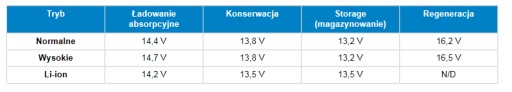 - Napięcie ładowania - Ładowanie podczas składowania: Normalne: 13,2 V High: 13,2 V Li-ion: 13,5 V