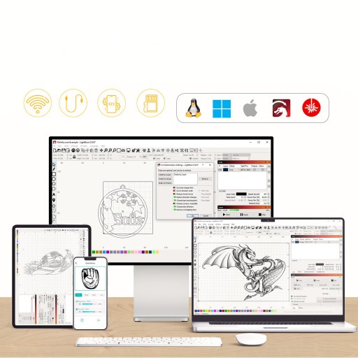 Ta maszyna do grawerowania obsługuje 4 tryby połączenia: USB/karta TF/WiFi/APP i obsługuje pracę w trybie offline, dzięki czemu możesz korzystać z RAY5 w dowolnym miejscu i czasie. Jest kompatybilny z profesjonalnym oprogramowaniem do grawerowania, takim jak LaserGRBL, LightBurn itp.
