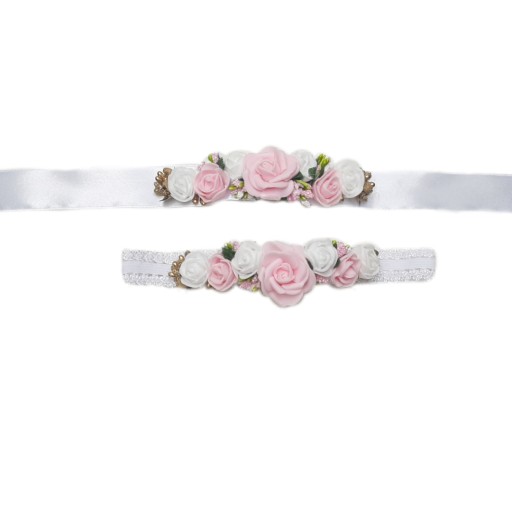 Zestaw do chrztu: opaska i pasek do sukienki w kolorze pudrowego różu bieli i zlota.