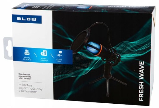 Wysokiej jakości mikrofon gamingowy marki BLOW z pełnym wyposażeniem, co umożliwia natychmiastowe użytkowanie.