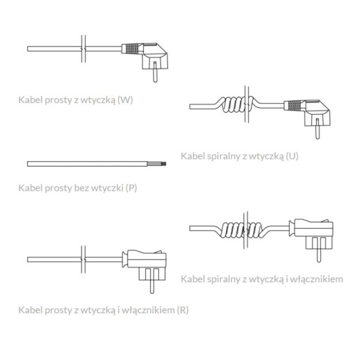 Przy składaniu zamówienia wybierz rodzaj kabla zasilającego: prosty z wtyczką, prosty z wtyczką i wyłącznikiem, prosty bez wtyczki, , spiralny z wtyczką, spiralny z wtyczką i wyłącznikiem.