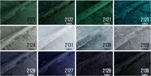 Eureka to bardzo miękki Velvet z długim włosiem - mocno cieniuje tworząc ciekawe rozwiązanie dla stylowych wnętrz. Jej wysoką jakość podkreśla obecność centkowania (posiada miejsca których osnowa (włos) układa się odwrotnie niż większość), dzięki temu nawet gdy tkanina zaczesana jest "pod włos" wygląda bardzo estetycznie tworząc efekt mienienia.