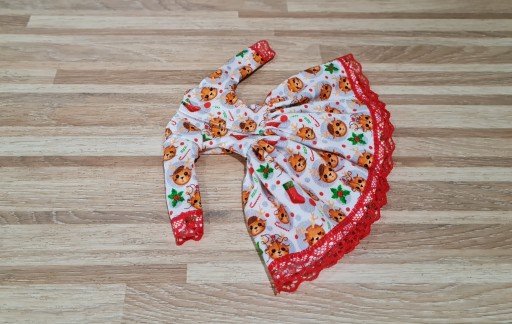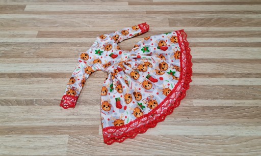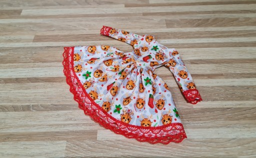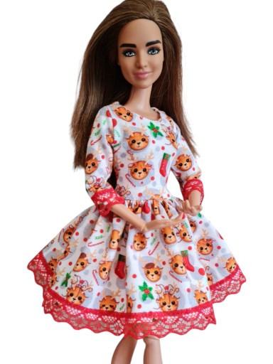 Przedmiotem sprzedaży jest śliczna sukienka dla lalki modowej. Uszyta z dzianiny w urocze reniferki. Ozdobiona koronką. Zapięcie na delikatny rzep.