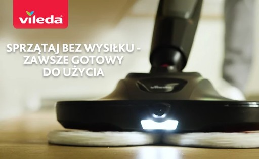 Mop elektryczny ze spryskiwaczem Vileda wyposażony jest w trwałą baterię wielokrotnego ładowania, która wystarcza nawet na 35 minut pracy.