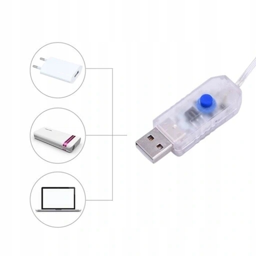 Kurtyna LED zasilana jest poprzez USB, przez co do rozświetlenia nie potrzeba bezpośredniego dostępu do prądu. Do jej aktywacji możesz użyć: