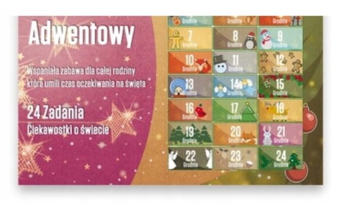 Prezentowany kalendarz super dopełni adwentową zabawię poprzez edukację i wyzwania. Dzięki wspólnej zabawie przeżyjesz wspaniałe chwile z najbliższymi wykonując przy tym pożyteczne i umacniające rodzinną więź świąteczne lub codzienne czynności.