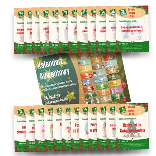 Prezentowane 24 szt. kart ciekawostek i zadań adwentowych to świetny pomysł na wspólnie spędzone i niezapomniane chwile podczas odkrywania codziennych niespodzianek w grudniowe dni.