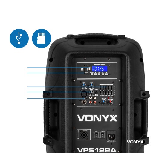 Vonyx VPS122A posiada wiele funkcji. W zestawie znajduje się wzmacniacz ze zintegrowanym czytnikiem USB/ SD oraz bezprzewodową technologią Bluetooth, który pozwoli na strumieniowe przesyłanie muzyki ze smartfonu lub tabletu. Dzięki 5-pasmowemu korektorowi i napędowi USB z cyfrowym wyświetlaczem możesz być pewien jakości tego zestawu i jego wydajności.