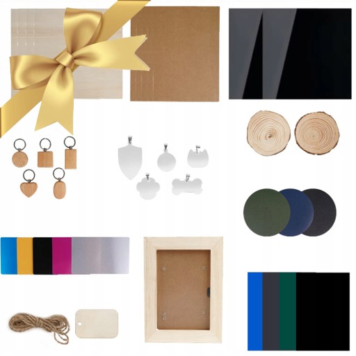 Zestaw pudełek z materiałami do grawerowania laserowego, 81 szt. materiałów do majsterkowania do grawerowania laserowego z metalowymi wizytówkami, sklejką, nieśmiertelnikami, ramkami do zdjęć, brelokami do kluczy, zawieszkami, skórzanymi podstawkami