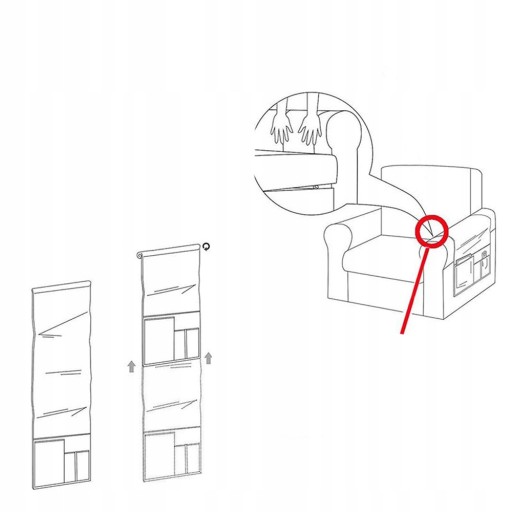 Podłokietnik kanapy z 5 kieszeniami. Największa kieszeń na gazety, czasopisma, książki, 4 małe kieszenie na okulary, piloty do telewizora, latarki, telefony komórkowe, słuchawki itp. Utrzymuje wszystko w zasięgu ręki i zmniejsza kłopoty z szukaniem ich wszędzie, chroni również ramię sofy lub fotela.