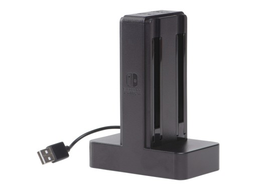 Ładowanie jest bardzo łatwe — po prostu wsuń kontroler Joy-Con w stację ładującą i zaczekaj, aż dioda LED zmieni kolor na zielony. Ładowarka jest zasilana przez port USB-A.