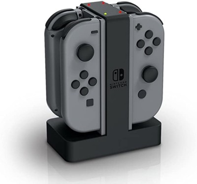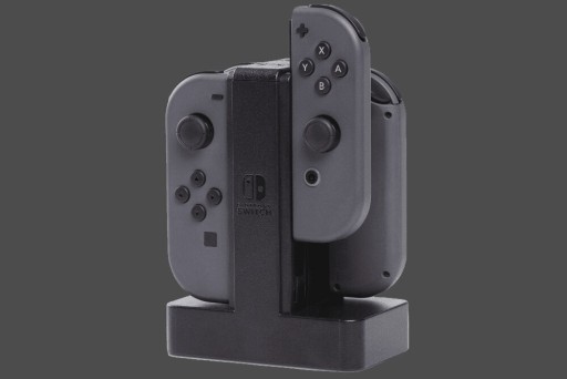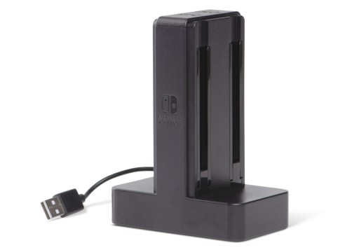 Ładowanie jest bardzo łatwe — po prostu wsuń kontroler Joy-Con w stację ładującą i zaczekaj, aż dioda LED zmieni kolor na zielony. Ładowarka jest zasilana przez port USB-A.