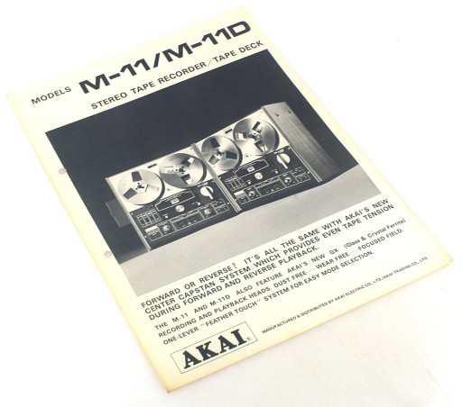 AKAI M-11/M-11D STEREO TAPE RECORDER/TAPE DECK, Wyd. AKAI ELECTRONIC CO LTD lata 60-te, s. 2, stan bdb-, j. angielski, format A4. Zawiera specyfikację techniczną sprzętu. Lekko czuć zapachem strychu. Printed in Japan.