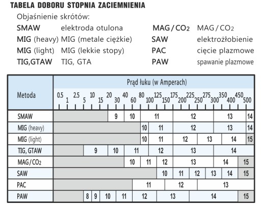 - Zakres stopni zaciemnienia: 9 -13 wg DIN