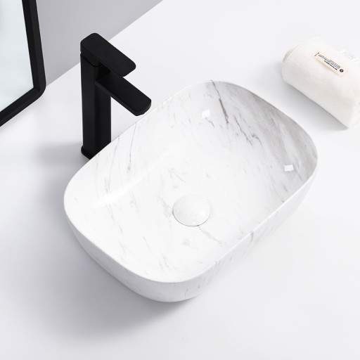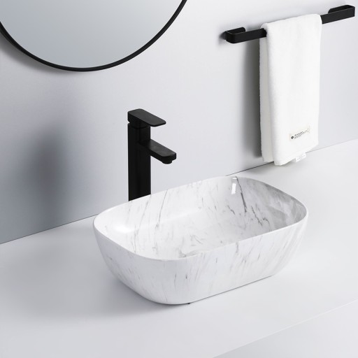 Biało-szara ceramiczna umywalka nablatowa, idealnie pasująca do wszystkich łazienek. Wykonana z wysokogatunkowej ceramiki sanitarnej, szkliwionej na wysoki połysk.