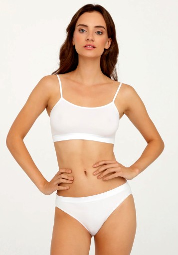 Miękki, przyjemny otulający kobiecy biust Top pozwala poczuć się luksusowo. Jest to zasługą połączenia bezszwowej technologii, przemyślanego kroju oraz delikatnego materiału. Przewiewna tkanina o grubości 60 den gwarantuje optymalną cyrkulację powietrza, a wykorzystana domieszka elastanu nadaje materiałowi rozciągliwości. Top idealnie przylega do ciała, a brak szwów i prosty fason pozwala uniknąć wrażenia ucisku bądź podrażnienia skóry. Subtelne ramiączka w połączeniu z elegancko wszytą gumką pod biustem gwarantują odpowiednie podtrzymanie piersi. Dzięki temu top idealnie nadaje się do ćwiczeń. sprawdza się tez pod odzież w upalne dni. Pochłania i odprowadza wilgoć, pozwalając poczuć się swobodnie nawet w szczególnie niedogodnych warunkach.