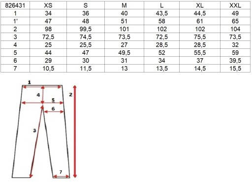 - posiadają dwie otwarte kieszenie po bokach, jedna kieszeń z tylu spodni zapinana na napa