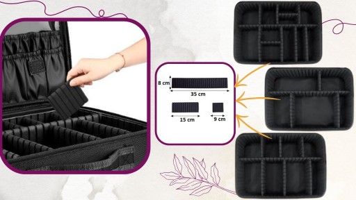 - ✅Główna przestrzeń kosmetyczki wyposażona jest w unikalny system regulowanych przegródek z pianki EVA, które można przesuwać i regulować dostosowując rozmiary przegródek wewnątrz kuferka do Twoich potrzeb.