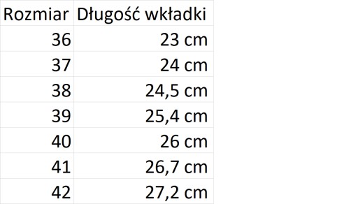 Długość wkładki wewnętrznej w zależności od rozmiaru śniegowca.