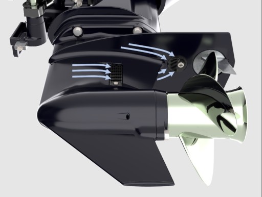 Obudowa przekładni MFS25/30D(W) zawiera dodatkowy pomocniczy port wlotu wody, zapewniający stały obieg wody chłodzącej. Pozwala to na dopływ wody chłodzącej w celu schłodzenia silnika, nawet jeśli główny wlot wody został pokryty zanieczyszczeniami morskimi.