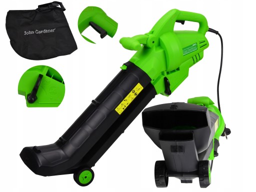 Odkurzacz z rozdrabniaczem / dmuchawa do liści John Gardener. Urządzenie wyposażone zostało w silnik elektryczny mocy 3300W z możliwością regulacji obrotów w zakresie 8000-14000 rpm.