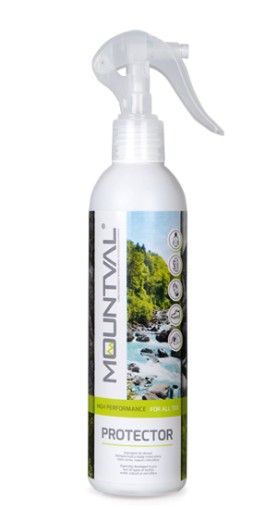Mountval Protector zapewnia wodoodporną powłokę butom turystycznym wykonanym ze skóry, nubuku, zamszu i tkaniny nie blokując właściwości wentylacyjnych butów. Przedłuża żywotność butów i chroni je przed brudem i błotem. Jest to produkt z atomizerem, który jest łatwy w użyciu w podróży.