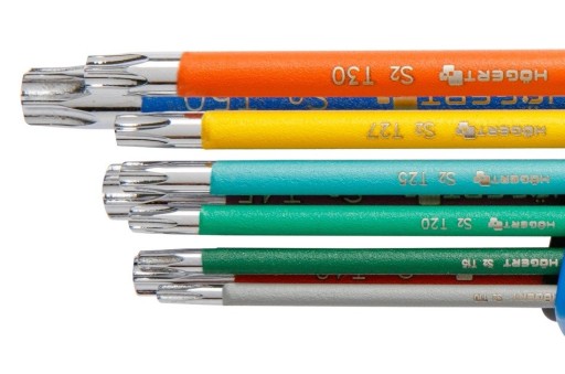 Zestaw kluczy TORX z kolorowym wykończeniem, gwarantującym szybką identyfikację rozmiarów.