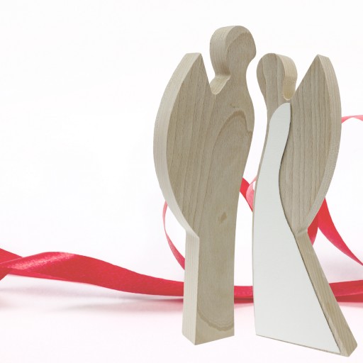 - Dwa Anioły wysokość 26 cm, grubość 2,5 cm. Anioły wykonane są z drewna bukowego, związane sznureczkiem z emblematem w kształcie serca wykonanego z filcu. Anioł symbolizujący postać żeńska ozdobiony jest dodatkowo sukienką wykonaną z beermaty.