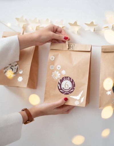Do pojemnych torebek z papieru kraft możesz wrzucić drobne upominki, takie jak kosmetyki, niewielkie zabawki, gadżety czy słodycze. Każdą z toreb ozdobisz kolorowymi naklejkami z numerkami oraz złotymi śnieżynkami czy gwiazdkami. Całość zawiesisz na jutowym sznurku, przyczepiając pakunki za pomocą drewnianych klamerek.
