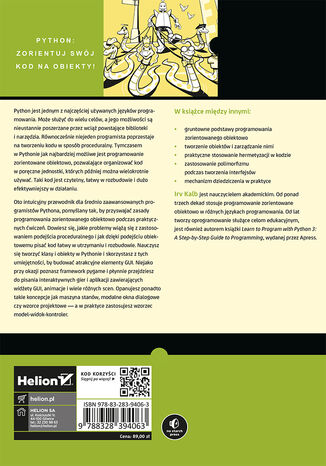 Python jest jednym z najczęściej używanych języków programowania. Może służyć do wielu celów, a jego możliwości są nieustannie poszerzane przez wciąż powstające biblioteki i narzędzia. Równocześnie niejeden programista poprzestaje na tworzeniu kodu w sposób proceduralny. Tymczasem w Pythonie jak najbardziej możliwe jest programowanie zorientowane obiektowo, pozwalające organizować kod w poręczne jednostki, których później można wielokrotnie używać. Taki kod jest czytelny, łatwy w rozbudowie i dużo efektywniejszy w działaniu.