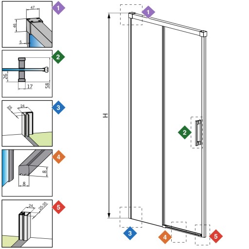 - Stabilna konstrukcja - stabilną konstrukcję kabiny gwarantuje solidny stabilizator górny zintegrowany z torem przesuwu drzwi oraz boczne profile instalacyjne.