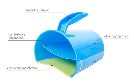 Specjalnie zaprojektowany kubek do spłukiwania włosów „akuku” uchroni Twoje dziecko przed niechcianymi kroplami wody spływającymi do oczu podczas mycia włosów.