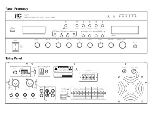 • Moc wyjściowa: 120W • Wyjścia linii głośnikowych 100V/70V, wyjście niskoimpedancyjne 4-16Ohm. • Idealnie zintegrofane funcje dla rozgłaszania muzyki tła i komunikatów. • Wbudowane: odtwarzacz MP3 i tuner AM/FM z pilotem zdalnej obsługi. • Wyświetlacz typu VFD w języku angielskim. • Port USB dla odtwarzania utworów MP3 . • Odtwarzanie utworów MP3 w trybach: individual oraz all cycle. • Tuner AM/FM wyposażony w pamięć 100 stacji nadawczych. • Strojenie tunera ręczne lub automatyczne. • 3 symetryczne wejścia mikrofonowe oraz 2 wejścia liniowe. • Pojedyncze wejście stereofoniczne typu AUX oraz wejcie wzmacniacza mocy. • Wbudowany 5 strefowy selektor stref głośnikowych. • Wejście typu EMC z priorytetem ponad pozostałymi wejściami za wyjątkiem wejścia MIC1. • Regulacja głośności AUX, MIC, MP3, Tuner oraz Master. Regulacja barwy: bas i sopran. • Regulacja poziomu wyciszenia dla MIC 1. • Diodowe sygnalizatory: zasilania, zabezpieczeń oraz wysterowania.