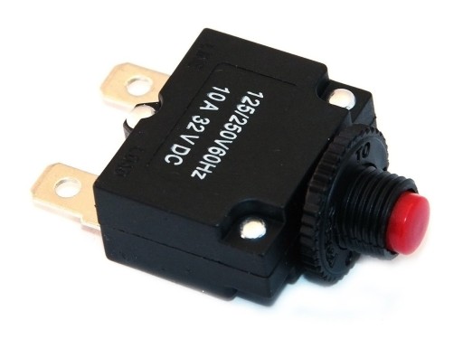 Bezpiecznik wyłącznik termobimetaliczny MR1 15A. Można go stosować jako bardzo zwłoczny bezpiecznik. W układach w których często dochodzi do krótkich przeciążeń.