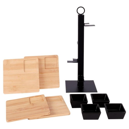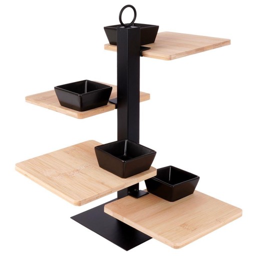 Czteropiętrowa patera do serwowania oraz ekspozycji wraz z czterema miseczkami na dipy lub sosy. Solidnie wykonana. Świetnie prezentują się na niej przystawki, przekąski oraz słodkości. Możemy wykorzystać ją do serwowania w efektowny sposób desek serów, wędlin oraz mięs. Idealnie sprawdzi się do przygotowania słodkich stołów, dzięki niej wyeksponujemy na stole słodkości oraz słone przekąski. Patera posiada oryginalny kształt i jest świetną alternatywą dla klasycznych, okrągłych pater. Dzięki czterem poziomom nie zajmuje dużo miejsca na stole. Utrzymana w modnej kolorystyce łączącej drewno z czarnym kolorem. Pasuje do każdego wnętrza. Sprawdzi się do użytku domowego oraz profesjonalnego. Wyprodukowano zgodnie z europejskimi standardami.