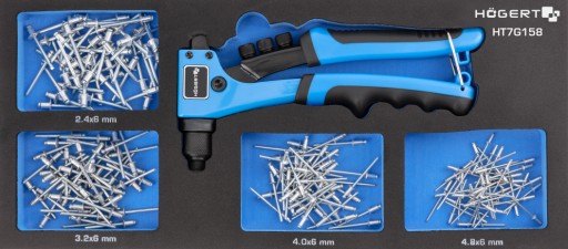 Wkład do szafek narzędziowych z nitownicą i zestawem nitów, niezbędny w szafce każdego profesjonalisty.
