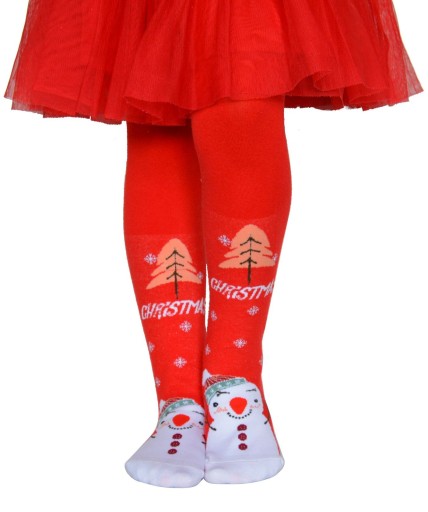 Śliczne czerwone rajstopki przyozdobione wzorami o tematyce świątecznej, to wyjątkowy dodatek do świątecznego stroju.