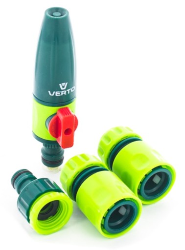 Zestaw składa się z 4 elementów: zraszacz prosty z blokadą wypływu wody, złączka przelotowa 1/2", złączka stop 1/2", przyłącze do kranu 1/2".