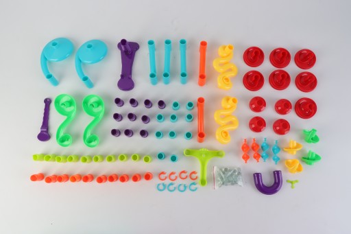 - 83 x elementy budujące (slalom, pętla, zjeżdżalnia, kołowrotek i inne) - zapakowane w hermetyczne worki, dzięki czemu wiesz, że dostajesz nowy nieużywany produkt.