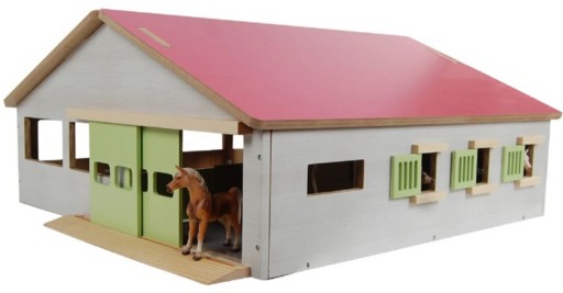 Duża drewniana stajnia wykonana została całkowicie z drewna i materiałów drewnopodobnych w skali 1:32. We wnętrzu posiada 3 boksów dla koni oraz wybieg.