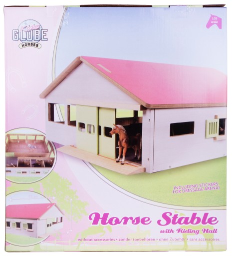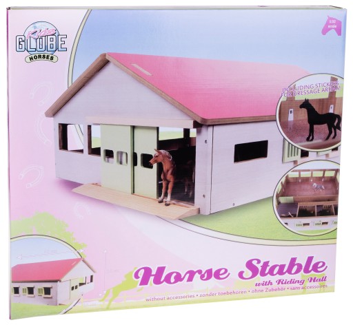 DREWNIANA STAJNIA DLA KONI 3 BOKSY I DUŻY TOR DO WYBIEGU 1:32 HORSE STABLE KIDS GLOBE RÓŻOWY 610271