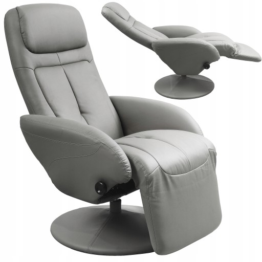 Komfortowy i ergonomiczny - jest rozkładany za pomocą podręcznego uchwytu przy oparciu, oparcie się odchyla, a podnóżek się wysuwa. W całości tapicerowany łatwą do utrzymania w czystości eco skórą. Wkomponuje się niemal w każde wnętrze. Obrotowa podstawa. Idealny na chwilę relaksu przy książce lub telewizji.