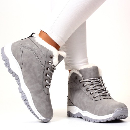 Damskie traperki zimowe w kolorze szarym.? Posiadają ocieplenie w postaci futerka. Stabilna, gruba podeszwa dobrze amortyzuje stopę i chroni ją przed zimnem.❄