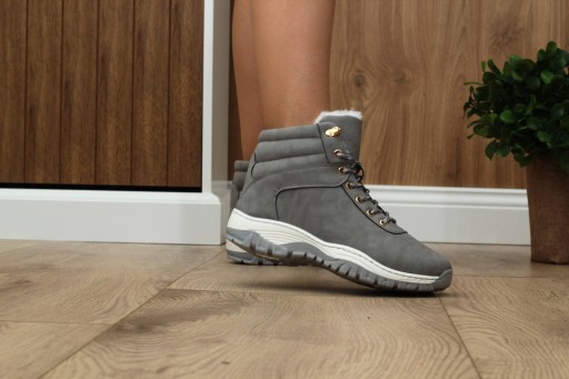 Damskie traperki zimowe w kolorze szarym.? Posiadają ocieplenie w postaci futerka. Stabilna, gruba podeszwa dobrze amortyzuje stopę i chroni ją przed zimnem.❄
