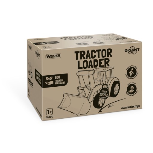 Masywny, duży traktor – ładowarka o długości 60 cm o realistycznym wyglądzie. Ruchoma łyżka traktora może służyć jako spychacz bądź ładowarka, co uatrakcyjni zabawę. Olbrzymią zaletą pojazdu jest solidność wykonania, trwałość i wytrzymałość konstrukcji. Gigant Traktor Ładowarka został wykonany z najwyższej jakości, bezpiecznego tworzywa odpornego na każdą pogodę.