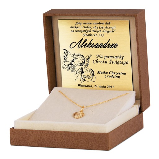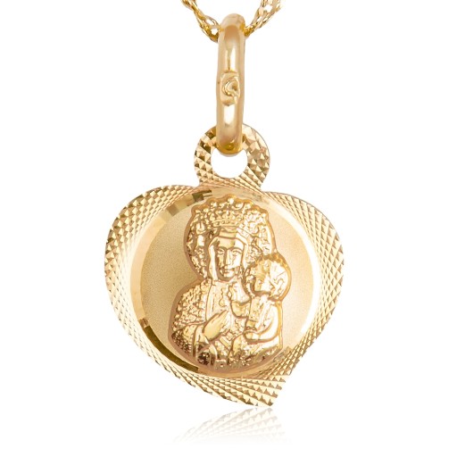 Medalik przedstawia postać Matki Boskiej Częstochowskiej wraz z Dzieciątkiem Jezus. Ta pełna miłości scena skomponowana w kształcie serca symbolizuje bezwarunkową miłość i rodzicielskie oddanie. Dzięki temu może stać się pomysłem na chrzest uwypuklającym uroczyste przyjęcie wiary chrześcijańskiej przez nowo narodzonego członka rodziny. Geometryczny wzór wykonany techniką diamentowania zwieńcza subtelny kształt serca wzbogacając go o połyskującą poświatę. Medalik zawieszony jest na łańcuszku o mocno splecionych ogniwach, co czyni go odpornym na rozdarcia i przypadkowe urazy mechaniczne. Łańcuszek posiada praktyczne zapięcie typu karabińczyk. Komplet wykonany jest ze złota próby 333. Do całości dołączane są metki jubilerskie z podaną próbą kruszcu, zbadaną przez Polski Urząd Probierczy.