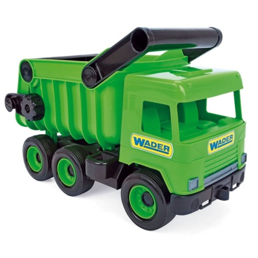 Duża i wytrzymała wywrotka w kolorze zielonym, z podnoszoną skrzynię ładunkową oraz otwieraną klapę. Pojazd ma z przodu zaczep.